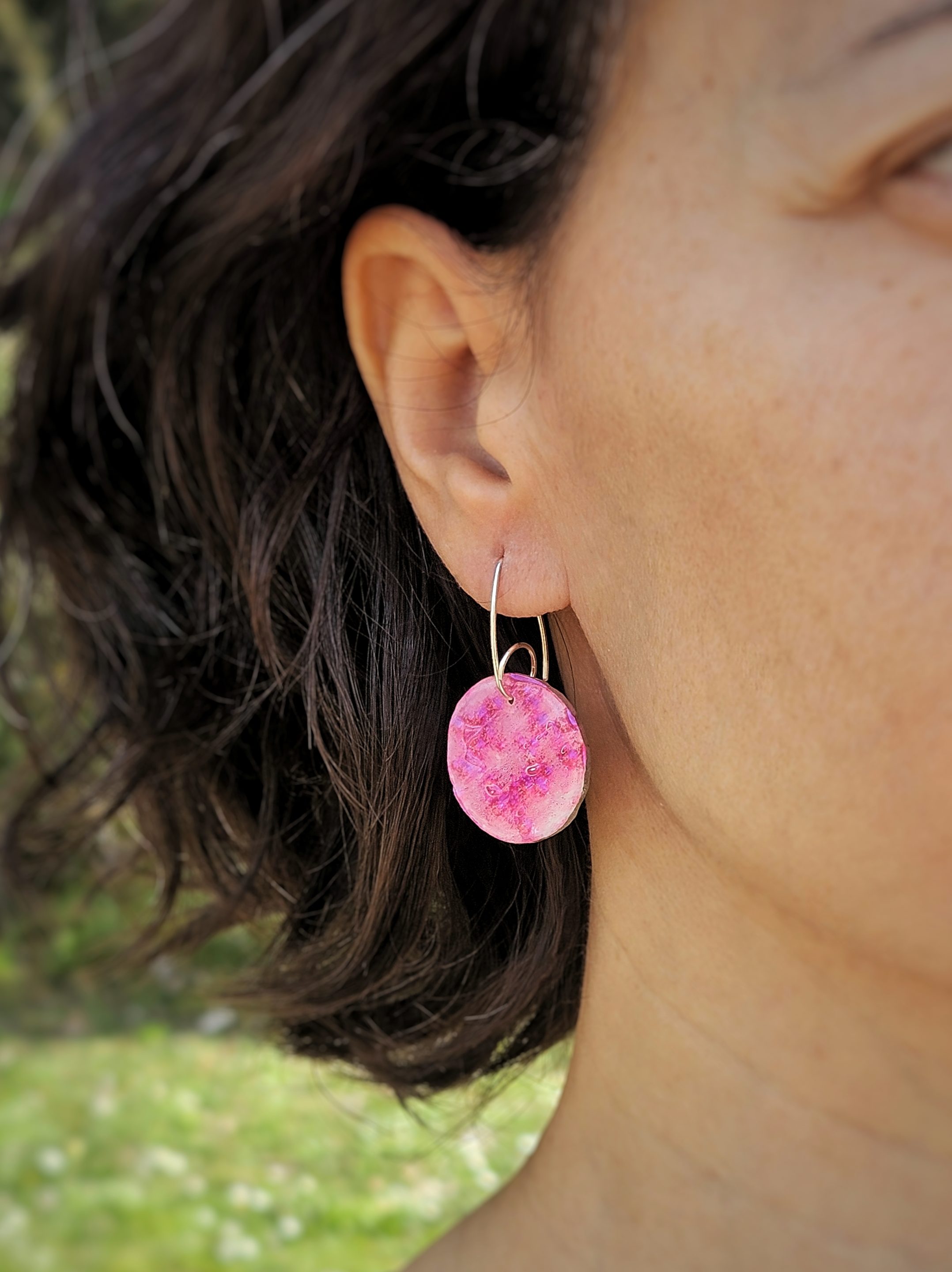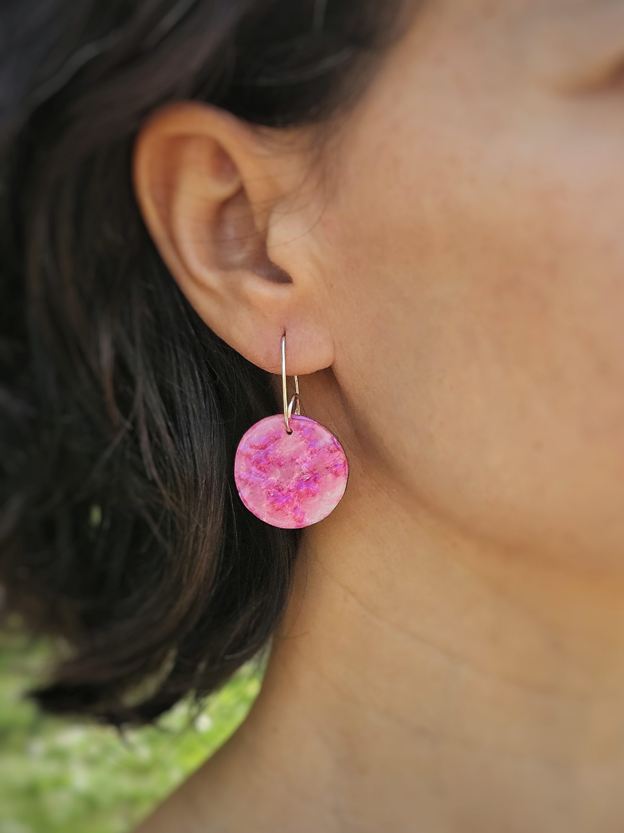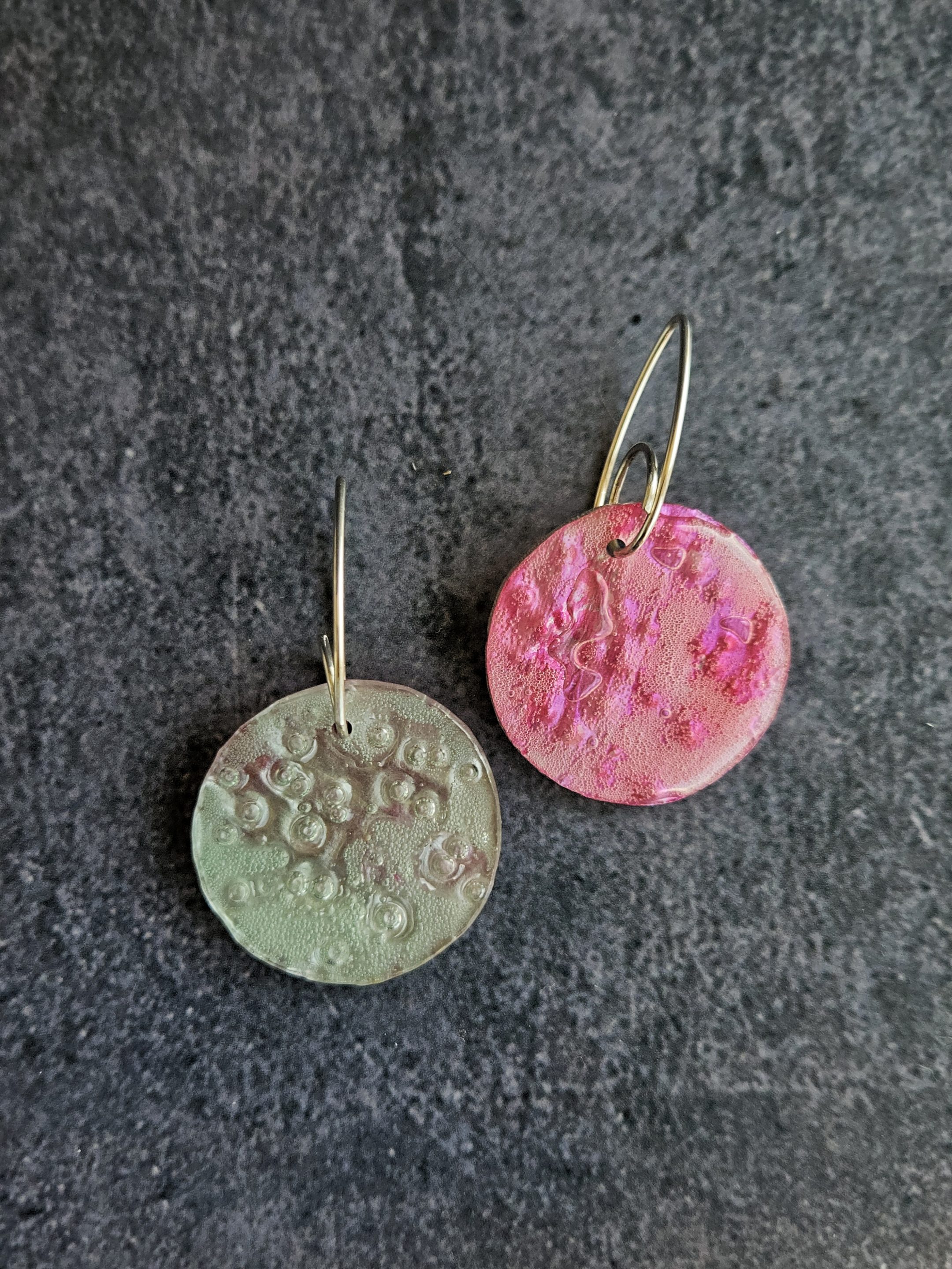 Pendientes artesanales de plata y CD. Pinto y sierro a mano cada pieza de CD, usando distintas técnicas y combinaciones de color para conseguir el acabado final. El engarce también está conformado artesanalmente a partir de hilo de plata 930. En su conjunto, cada par de pendientes tendrá una serie de características que harán que tus pendientes sean únicos e irrepetibles. Detalles del artículo: -Plata 930, van colgados de la oreja mediante un gancho largo. -CDs postconsumo reutilizados como pieza de joyería. -Hecho a mano en mi pequeño taller.