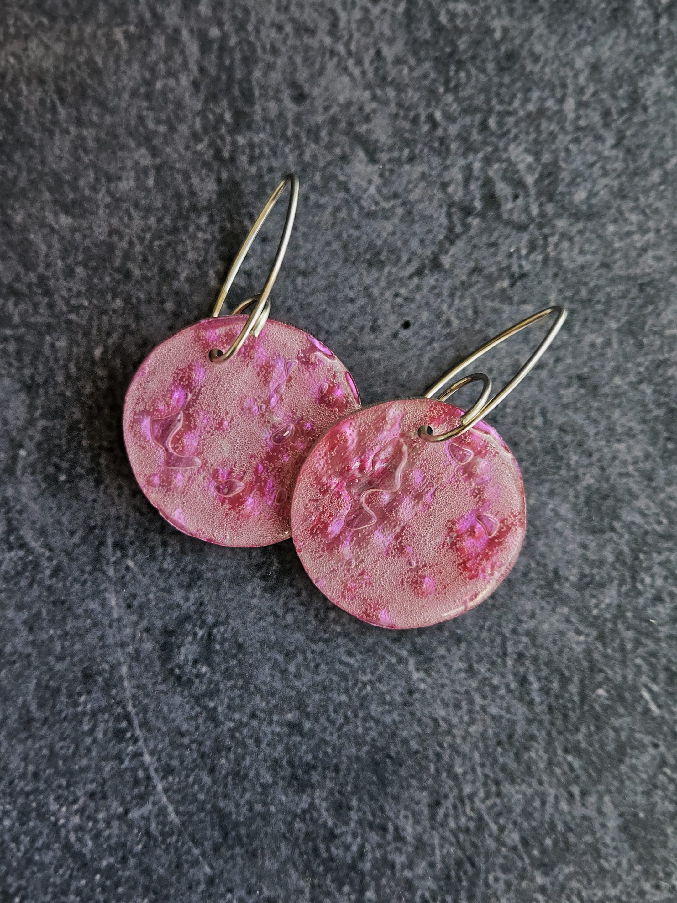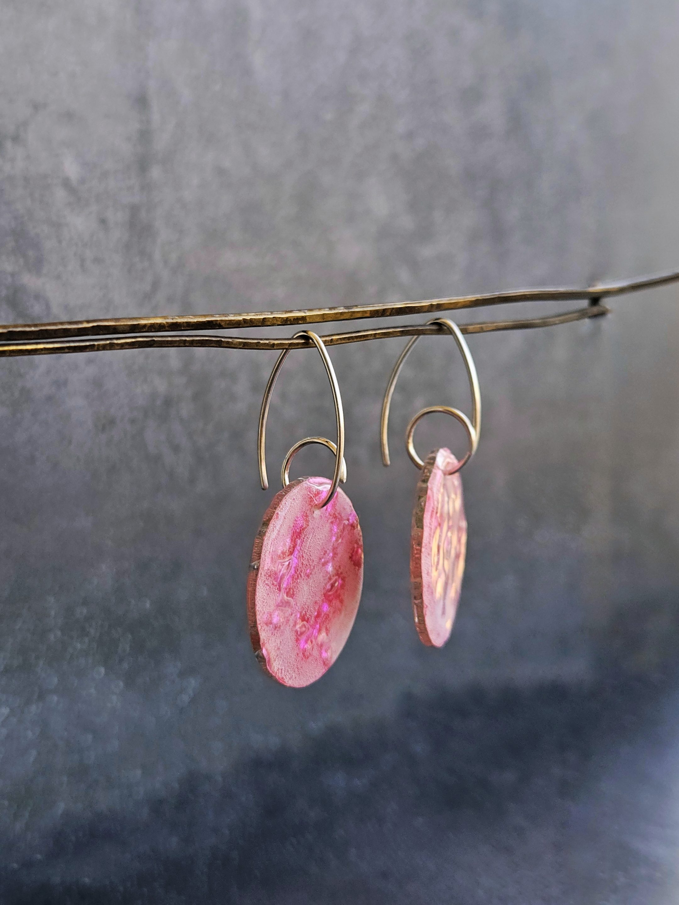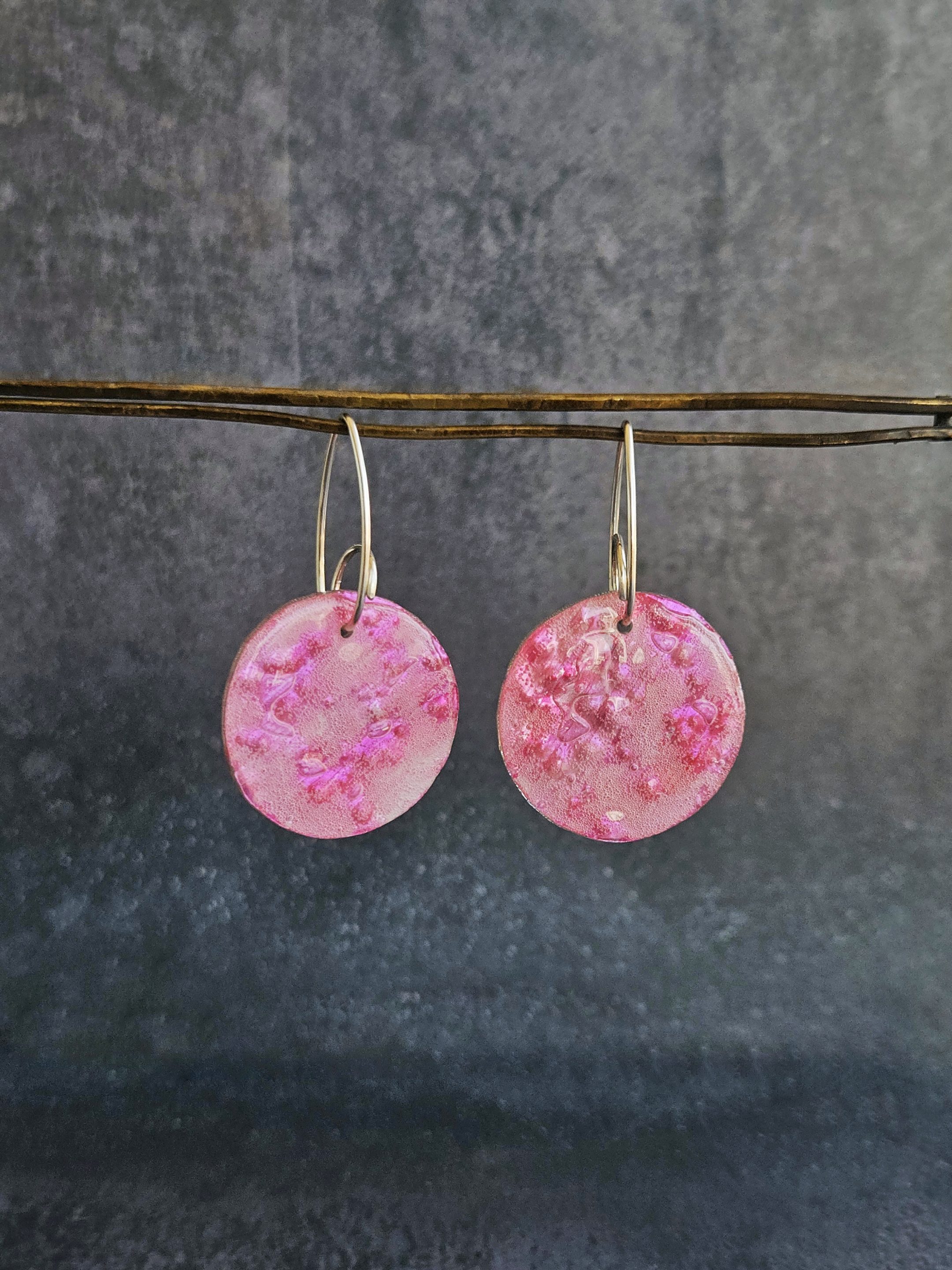 Pendientes artesanales de plata y CD. Pinto y sierro a mano cada pieza de CD, usando distintas técnicas y combinaciones de color para conseguir el acabado final. El engarce también está conformado artesanalmente a partir de hilo de plata 930. En su conjunto, cada par de pendientes tendrá una serie de características que harán que tus pendientes sean únicos e irrepetibles. Detalles del artículo: -Plata 930, van colgados de la oreja mediante un gancho largo. -CDs postconsumo reutilizados como pieza de joyería. -Hecho a mano en mi pequeño taller.