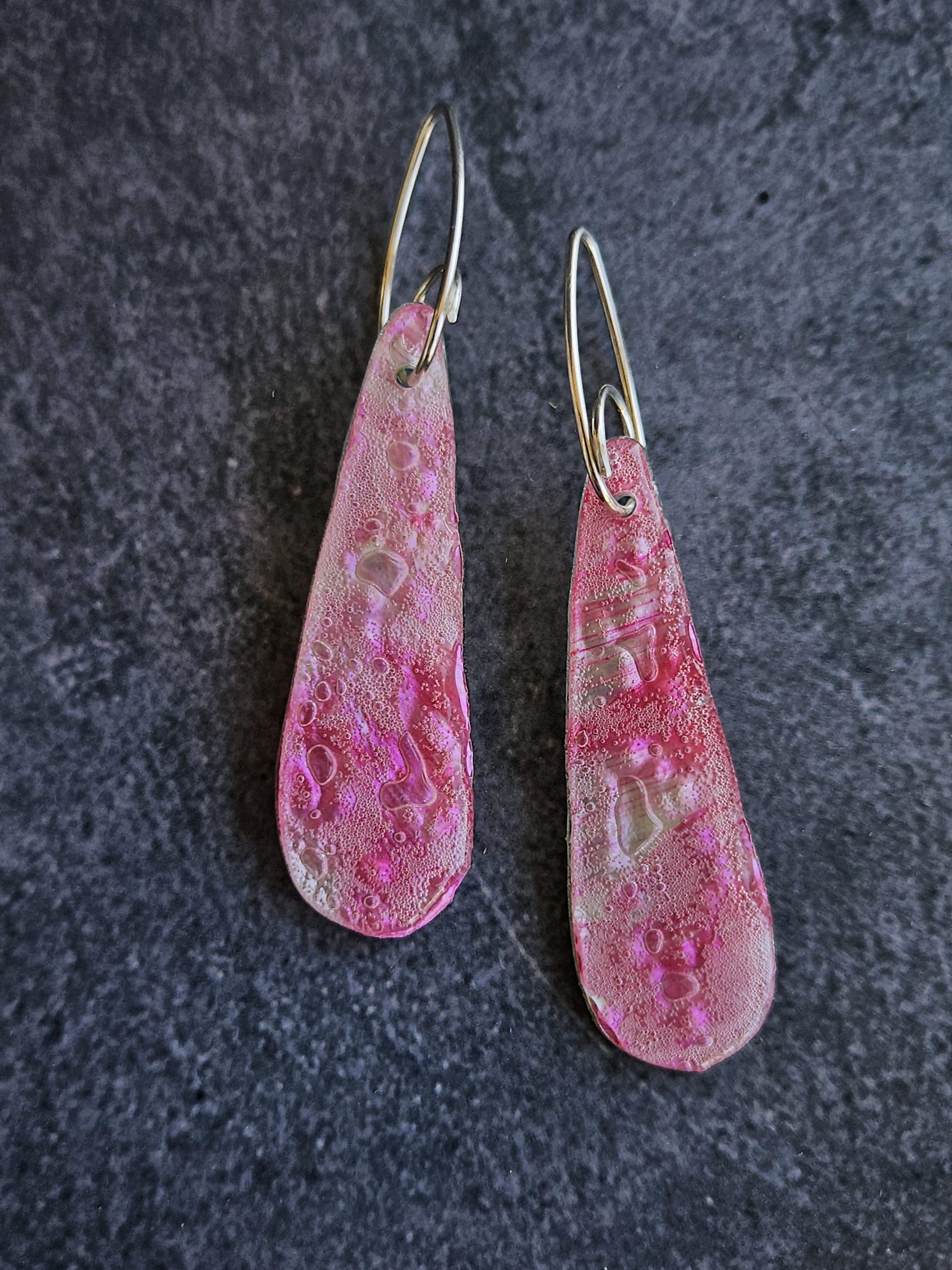 Pendientes artesanales de plata y CD. Pinto y sierro a mano cada pieza de CD, usando distintas técnicas y combinaciones de color para conseguir el acabado final. El engarce también está conformado artesanalmente a partir de hilo de plata 930. En su conjunto, cada par de pendientes tendrá una serie de características que harán que tus pendientes sean únicos e irrepetibles.